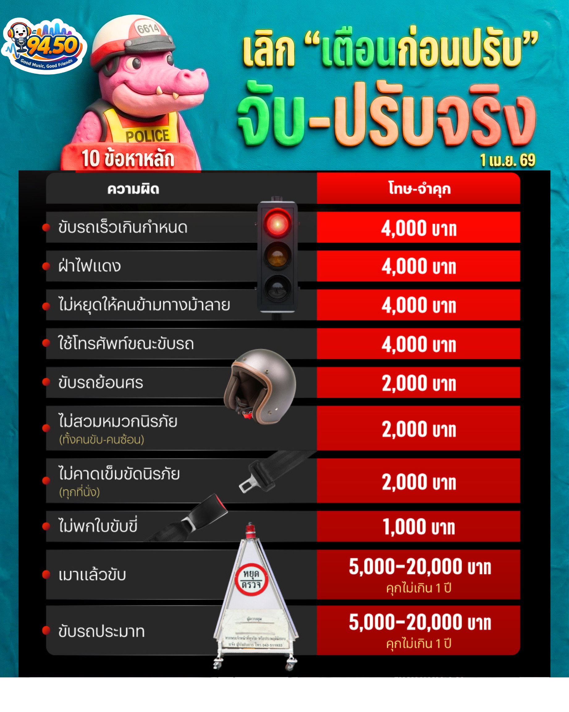 🔴 ฝ่าไฟแดง / ขับรถเร็ว / ไม่หยุดให้คนข้ามทางม้าลาย: ปรับสูงสุด 4,000.- (จากเดิม 1,000.-)